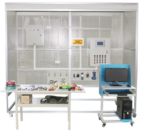 本設備可進行電工安裝。如橋架安裝、PVC管安裝、吊燈、白熾燈座、日光燈、開關、插座、配電箱、控制箱等,裝置還包含有交流異步電動機、直流電動機、步進電機、伺服電機、溫度控制器、電偶、PLC、變頻器觸摸屏。該系統每個操作組配套一可移動式工具車和元件柜,便于對元件的保管和安裝施工。從根本上解決了學校在普通墻面上進行的安裝培訓的使用不方便、實訓范圍窄的問題