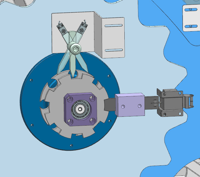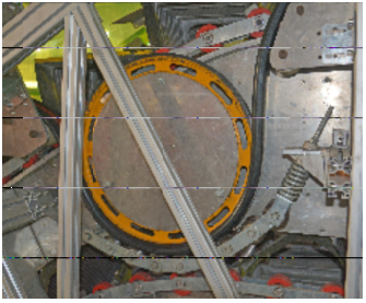 防逆轉裝置如下圖,裝置裝在扶梯上部驅動位。在扶梯上行時凸輪順時針轉動,若扶梯發(fā)生異常情況而逆轉則凸輪逆轉,此時打桿使限位開關動作并使扶梯主剎動作從而使扶梯停止,反之亦然。同時此功能具備手動測試操作功能。