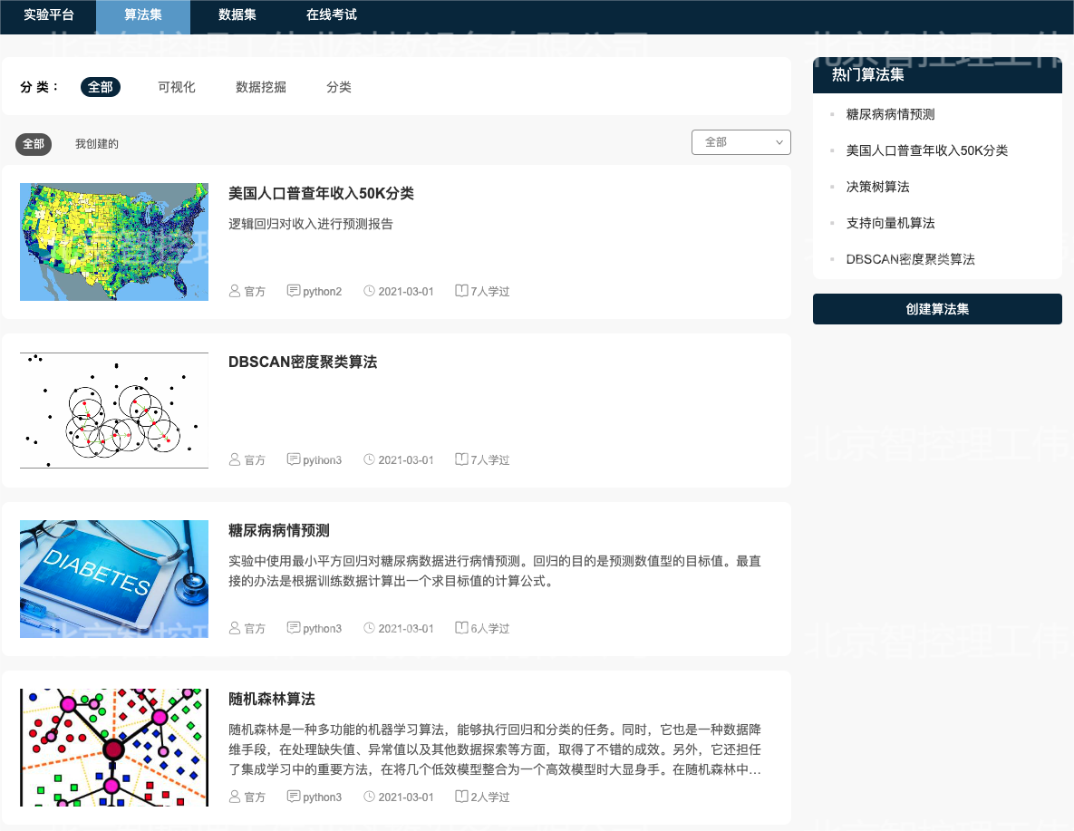 人工智能實訓(xùn)課程資源共計200多個,資源涵蓋了操作系統(tǒng)類、數(shù)據(jù)庫類、編程語言類、統(tǒng)計分析類、機(jī)器學(xué)習(xí)類、神經(jīng)網(wǎng)絡(luò)與深度學(xué)習(xí)類、自然語言處理類、機(jī)器視覺類、智能硬件類課程等諸多方面課程,課程類型包括基礎(chǔ)實訓(xùn)、關(guān)鍵技術(shù)掌握、應(yīng)用創(chuàng)新等,是一個綜合性的學(xué)習(xí)研究平臺;平臺配合專用的資源監(jiān)控系統(tǒng)、課程監(jiān)控系統(tǒng),可實時的監(jiān)控整個平臺的硬件資源負(fù)載以及學(xué)生學(xué)習(xí)的狀態(tài),可幫助教師合理的安排課程及對應(yīng)資源。