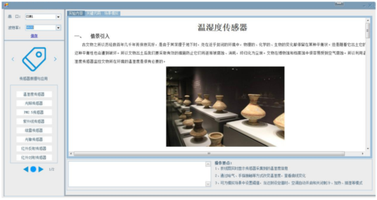 物聯(lián)網(wǎng)基礎(chǔ)技術(shù)原理教學(xué)平臺的軟件模塊,采用C#上位機(jī)教學(xué)資源軟件及聯(lián)動場景案例,針對傳感器技術(shù)的教學(xué),每一個傳感器的原理、實驗?zāi)康摹嶒炘怼嶒瀮?nèi)容、實驗步驟、等實驗指導(dǎo)書內(nèi)容移植到軟件模塊上,同時對實驗過程、實驗現(xiàn)象相對應(yīng)顯示出來,實現(xiàn)了理實一體化教學(xué)的效果。并且可以在此軟件模塊上加載各系列硬件模塊套件的教學(xué)資源,包括實驗場景引入,實驗?zāi)康模R點掌握,實驗步驟,關(guān)鍵代碼解析,實驗現(xiàn)象及實驗場景聯(lián)動。能夠讓學(xué)生不僅學(xué)習(xí)傳感器概念、原理,并且可以在邊學(xué)原理邊練習(xí)操作和開發(fā),生動且有趣。軟件模塊的界面截圖如下圖所示:
