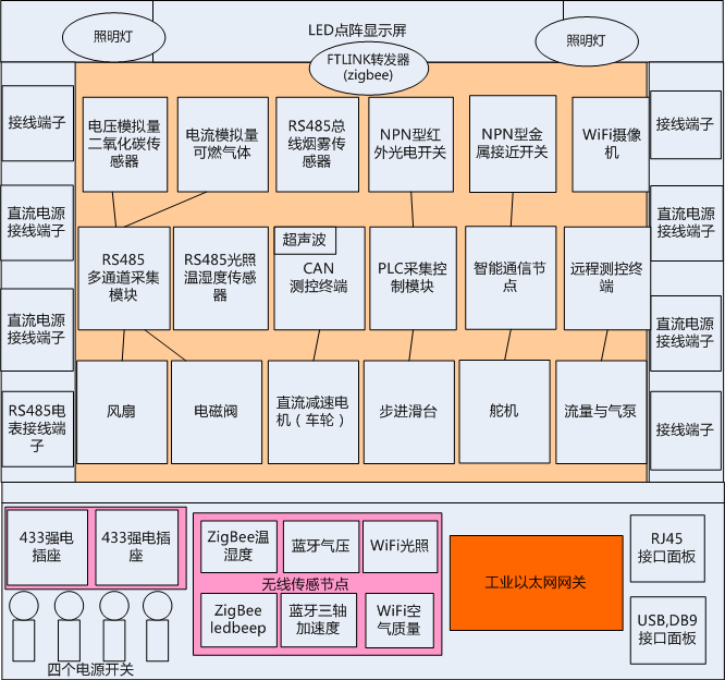實訓臺主要由工業以太網網關、無線傳感節點區、網孔實訓區、以及臺體框架(含電源接線端子、傳感器接線端子、通信接口面板等)組成。布局如圖所示: