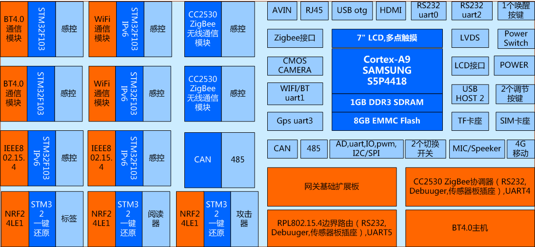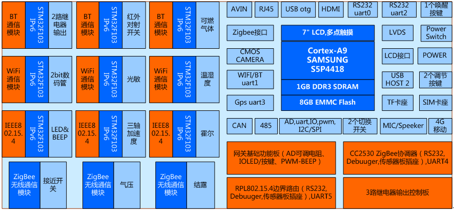 1)能夠滿足單片機接口及應(yīng)用、傳感器接口及應(yīng)用、無線傳感網(wǎng)、嵌入式操作系統(tǒng)開發(fā)、嵌入式Linux應(yīng)用開發(fā)、Android移動應(yīng)用開發(fā)等課程要求。 2)能夠組建藍牙、WiFi、IEEE802.15.4、ZigBee四種無線網(wǎng)絡(luò),實現(xiàn)數(shù)據(jù)的無線傳輸; 3)能夠?qū)⑺{牙、WiFi、IEEE802.15.4無線網(wǎng)絡(luò)經(jīng)IPV6協(xié)議、Zigbee節(jié)點經(jīng)ZStack協(xié)議融合在一個拓撲圖中,在界面上顯示藍牙、WiFi、RPL802.15.4、ZigBee等節(jié)點的傳感器數(shù)據(jù)或執(zhí)行器狀態(tài),并實時流動地顯示各個傳感器數(shù)據(jù)的上、下行走向; 4)要求藍牙、WiFi、IEEE802.15.4三種傳感器節(jié)點均具有唯一的IPv6地址,統(tǒng)一采用IPv6協(xié)議組包通信。 5)要求網(wǎng)關(guān)支持Linux、Android雙操作系統(tǒng),支持一鍵燒寫、一鍵切換。 6)要求在保證網(wǎng)關(guān)接入互聯(lián)網(wǎng)的前提下,能夠配置接入云服務(wù)平臺,并實現(xiàn)移動端傳感器數(shù)據(jù)的采集顯示和執(zhí)行器的遠程控制。 二、硬件資源 1.Cortex-A9網(wǎng)關(guān)(1個) 1)核心板資源: (1)CPU:Cortex-A9四核心的Samsung s5p4418,主頻1.4GHz; (2)GPU:MAIL-400,3D圖形加速 (3)內(nèi)存: 1GB DDR3; (4)EMMC: 8GB; (5)核心板+底板設(shè)計:核心板加裝屏蔽罩,郵票孔方式與底板連接,抗干擾能力更強,比插針式更穩(wěn)定可靠。要求引出核心板信號線,不少于188PIN。 2)網(wǎng)關(guān)主板資源: (1)LCD接口:7寸IPS電容屏(16:9),分辨率1024×600; (2)USB接口:2路USB_HOST 2.0輸出,1路USB OTG; (3)Ethernet接口:核心板內(nèi)置千兆IP,外加不超過3RMB的PHY芯片即可,支持10/100/1000M,RJ45接口; (4) 串口:2路3線RS232,1路TTL接口,1路RS485,1路Bluetooth; (5)CAN總線接口:1路; (6)RS485總線接口:1路; (7)HDMI 接口:HDMI1.4a,*大支持1920*1080高清數(shù)字輸出; (8)LVDS液晶屏接口:單通道,*大支持1920*1080; (9)攝像頭接口:1路CMOS并行接口,*大支持800萬像素; (10)AV接口:1路模擬視頻母口輸入; (11)外部存儲擴展接口:SD卡、TF卡接口; (12)音頻接口: 1路MIC輸入,1路1. 8w喇叭; (13)按鍵:1個復(fù)位按鍵、1個休眠喚醒按鍵,2個音量鍵; (14) 藍牙WiFi:板載藍牙WiFi二合一模塊; (15)Mini PCIe接口:標(biāo)準(zhǔn)可插入4G通信模模塊; (16)24Pins應(yīng)用擴展接口:用于處理器外設(shè)接口擴展功能,包含3路串口、1路PWM、1路IIC、1路ADC、8個GPIO,5V電源。 2.網(wǎng)關(guān)IO基礎(chǔ)擴展板(1個) 由網(wǎng)關(guān)直接驅(qū)動。采用HC595串入并出特點,使用較少IO擴展更多功能,默認地址0x01。1路可調(diào)電位器模擬AD采樣通道,1路PWM驅(qū)動的蜂鳴器,5個觸摸按鍵,5個LED指示燈。 3.三路繼電器擴展板(1個) 由網(wǎng)關(guān)直接驅(qū)動。采用HC595串入并出特點,使用較少IO擴展更多功能,默認地址0x10。 可控制3路繼電器,線圈機械式觸點,1個常開,1個常閉,*大負載10A/277V AC。 4. ZigBee協(xié)調(diào)器(1個) 與網(wǎng)關(guān)的TTL UART連接。采用CC2530單片機外設(shè)接口、射頻通信與ZStack協(xié)議棧的方案,具備Zigbee建網(wǎng)功能,具有2個組網(wǎng)狀態(tài)及無線傳輸指示燈,2個功能按鍵,提供傳感器模塊接口、RS232接口、調(diào)試下載接口。 5. IEEE802.15.4主機(1個) 與網(wǎng)關(guān)的TTL UART連接。采用CC2530射頻功能與802.15.4的從機組建射頻網(wǎng)絡(luò),接收從機信息,向從機發(fā)送命令。具有2個組網(wǎng)狀態(tài)及無線傳輸指示燈,2個功能按鍵,提供傳感器模塊接口、RS232接口、調(diào)試下載接口。 6.無線傳感網(wǎng)通信節(jié)點(12個) 1)微控制器主板硬件資源 (1)Cortex-M3核心主板(9個) 處理器基于ARM Cortex-M3核心的STM32F103,*高主頻72Mhz,內(nèi)部Flash 256KB,RAM 48KB。 具有1個0.96寸OLED屏,能夠顯示MAC地址、上下級關(guān)系、傳感器數(shù)據(jù)、網(wǎng)絡(luò)信息等。 具有4個組網(wǎng)狀態(tài)及無線傳輸指示燈,2個功能按鍵、1個JTAG調(diào)試接口、1個24PIN的無線射頻接口,1組20*2PIN傳感器接口; 標(biāo)配ARM仿真器、串口下載仿真調(diào)試轉(zhuǎn)接板。 運行IPv6協(xié)議棧實現(xiàn)無線通信的功能。 (2)CC2530核心主板(3個) 處理器基于CC2530F256,具有2個組網(wǎng)狀態(tài)及無線傳輸指示燈,2個功能按鍵、1個JTAG調(diào)試接口、1個24PIN的無線射頻接口,1組20*2PIN傳感器接口; 標(biāo)配下載仿真器。 2)無線傳感網(wǎng)通信模塊 (1)藍牙通信模塊(3個):采用UART接口的內(nèi)置協(xié)議棧方案,設(shè)置從機模式,與主機配對后,將微控制器采樣數(shù)據(jù)傳輸給主機。 (2)WiFi通信模塊(3個):采用UART接口的內(nèi)置TCP/UDP/HTTP協(xié)議棧方案,支持設(shè)置為AP、STA的工作模式,與網(wǎng)關(guān)通信后,將微控制器采樣數(shù)據(jù)傳送給主機,或者接收主機的控制命令控制執(zhí)行器。 (3)IEEE802.15.4通信模塊(3個):基于CC2530射頻組網(wǎng)通信方案,與邊界路由器組網(wǎng),實現(xiàn)傳感器數(shù)據(jù)的雙向交互。 (4)ZigBee通信模塊(3個):基于CC2530+ZStack協(xié)議棧組網(wǎng)通信方案,與Zigbee協(xié)調(diào)器組網(wǎng),實現(xiàn)傳感器數(shù)據(jù)的雙向交互。 3)傳感器通信模塊(12個) 接口至少包含GPIO/IIC/SPI/PWM/電源/地等信號。 兼容紅外接近開關(guān)、可燃氣體傳感器、繼電器控制、雙位數(shù)碼管顯示、溫濕度傳感器、光敏傳感器、LEDBEEP聲光執(zhí)行器、霍爾傳感器、三軸加速度傳感器、紅