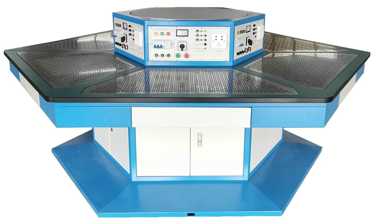 2、六邊形電源控制屏:電源控制屏采用六邊形結構,與工作臺相對應。框架采用優質鞍鋼盒裝鋼板,經過機械加工成型,外表面噴涂彩色環氧聚塑。六個作業面配置有實訓電源及主機控制系統,控制面板具有漏電保護、短路保護功能。電源控制屏頂面采用10mm厚的鋁框包邊,內置有直徑為850mm的多角度公共操作平臺,公共操作平臺能360°旋轉,能做120°定位,平臺頂板采用10mm厚的鋁板加工成型,能載重約60Kg的典型工作任務。