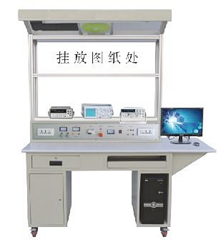 實訓臺上方裝有電風扇、照明日光燈、中間是看板、儀表臺、插座、工具柜、電烙鐵和元件盒。