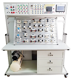 2、實訓裝置主框架采用歐標鋁型材結構,實訓面板傾斜鋁型材結構平臺,主要用于安裝氣動相關元件,型材表面有標準的兩道固定槽,最上面層主要以電氣控制位置。